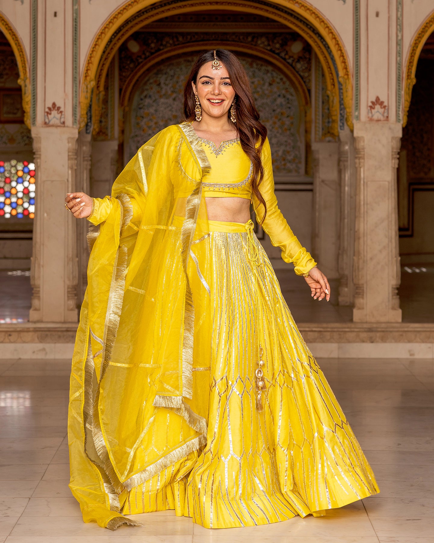 The spellbinding juxtaposition of gota and tassels on the charming Chanderi canvas is what Garba dreams are made of! Pull up a bright yet glimmering look in our sumptuous lehenga ensemble from our issue of Durga Puja outfits.