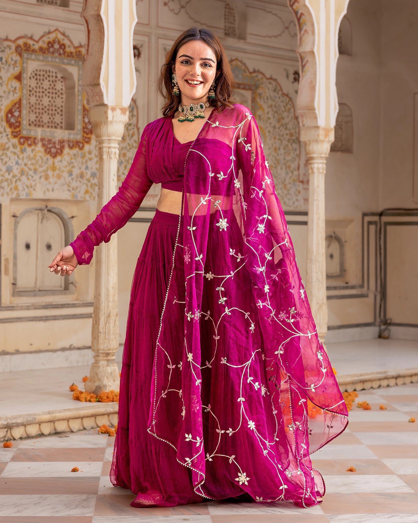 No Dandiya or Garba look is complete with a bit of glam and drama. Go overboard in our tiered and pleated lehenga ensemble with a statement one-shoulder choli. Bedecked with a kaccha gota accent, this palatial purple from our Durga Puja outfits edit is going to serve you the ravishing look you truly deserve!