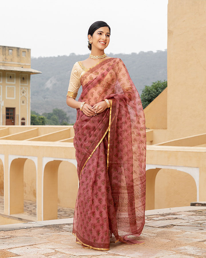 Step out to attend the puja aarti in our dainty rose organza drape. Ornate with charming handblock imprints, the saree from our edit of Durga Puja outfits stands out for its minimal appeal.