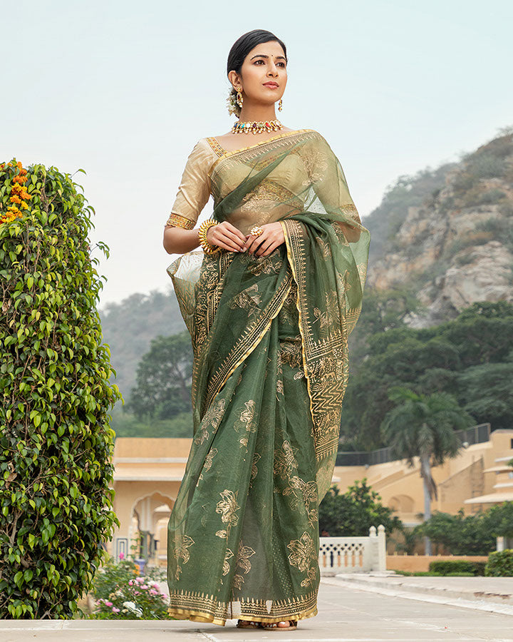 Gleam in our green organza drape, beaded with the glint of the charming foil print tale. Go for an unconventional drape style to stand out further in our opulent saree from the Durga Puja outfits collection.