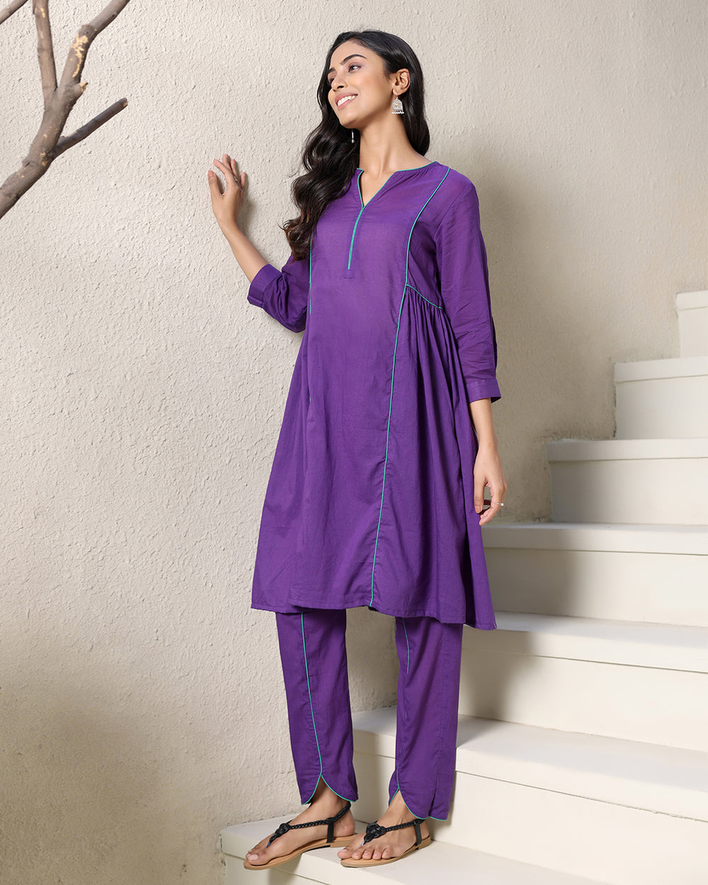This purple A-line kurta set is crafted from soft cotton fabric, featuring a collar neck and a beautifully flowy silhouette. The kurta is paired with matching straight trousers, offering a comfortable yet chic ensemble ideal for workwear.