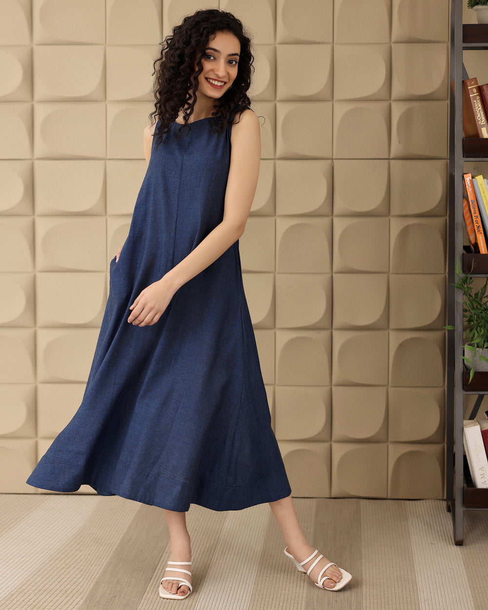 Effortlessly polished, this navy midi dress in soft cotton is tailored for all-day comfort. Its A-line silhouette flatters every frame, while the sleeveless cut keeps it modern and minimal- ideal for work and beyond.