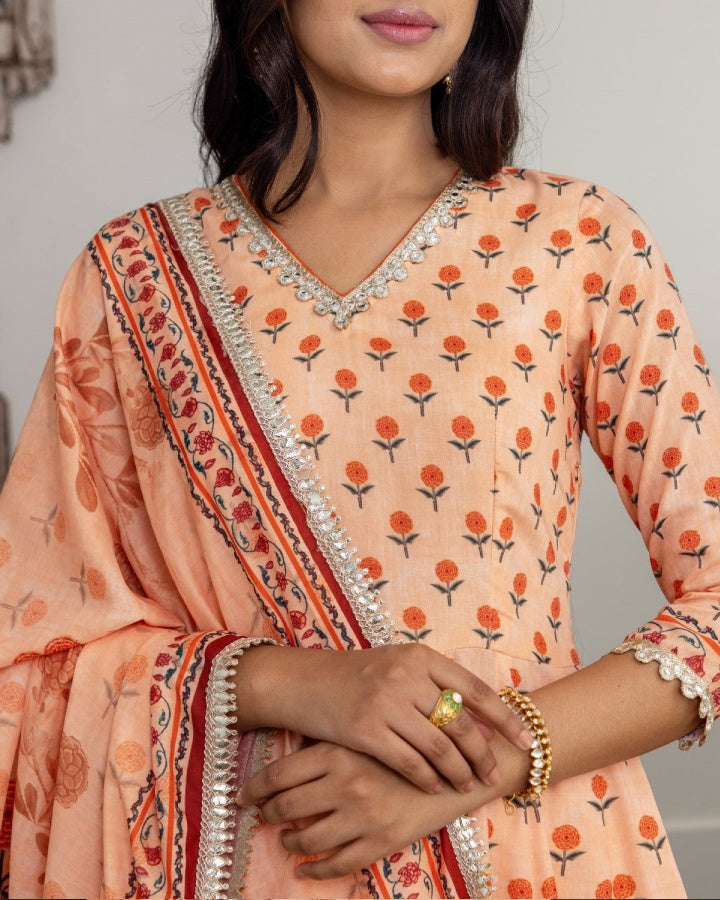 Stunning floral designs on muslin give this outfit its modern Indian feel. Bloom in one of the season's primary colours. Soft against the skin, this kurta is decorated with lovely lace details. It is coupled with a printed muslin dupatta that also has nice lace trimming. Add some jewellery to this ensemble, and you're ready to go!
