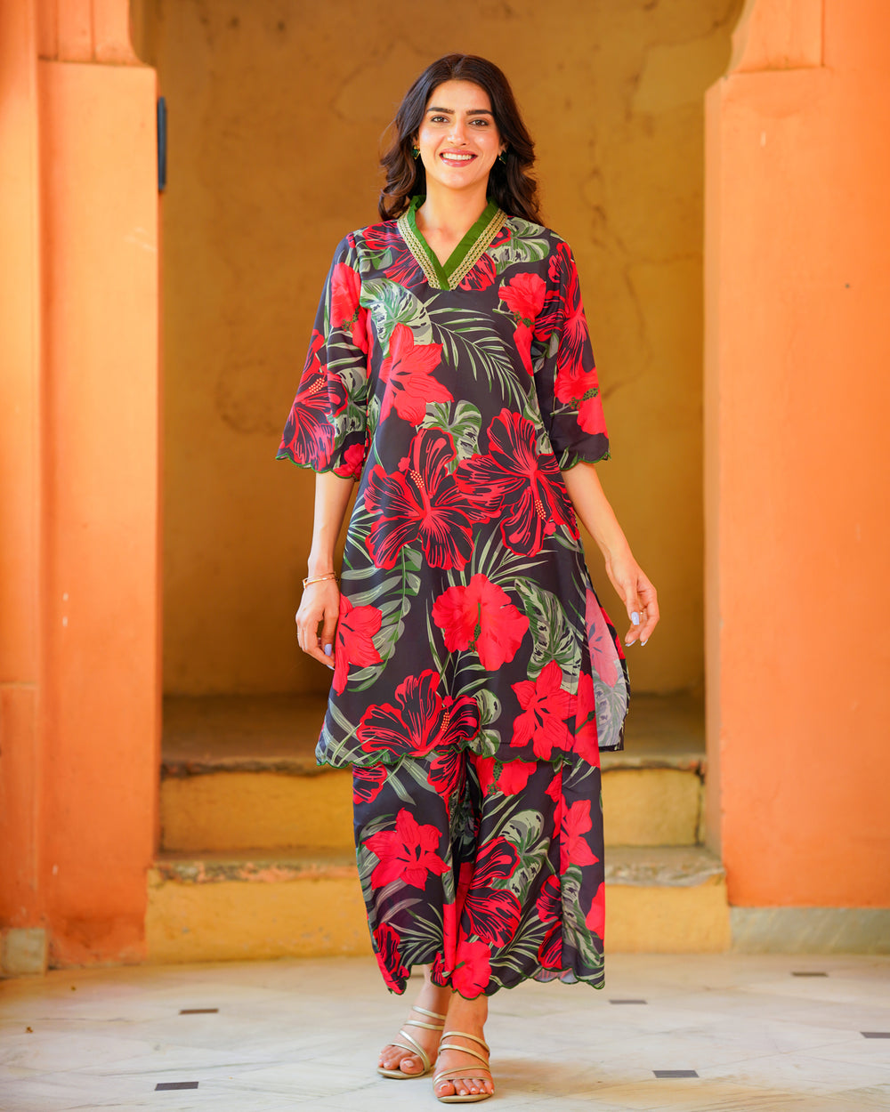 Enchant everyone with our black tropical summer suit set, made to make you feel beautiful and confident. Our 2-piece set includes a vneck straight kurta, flared palazzos bottoms