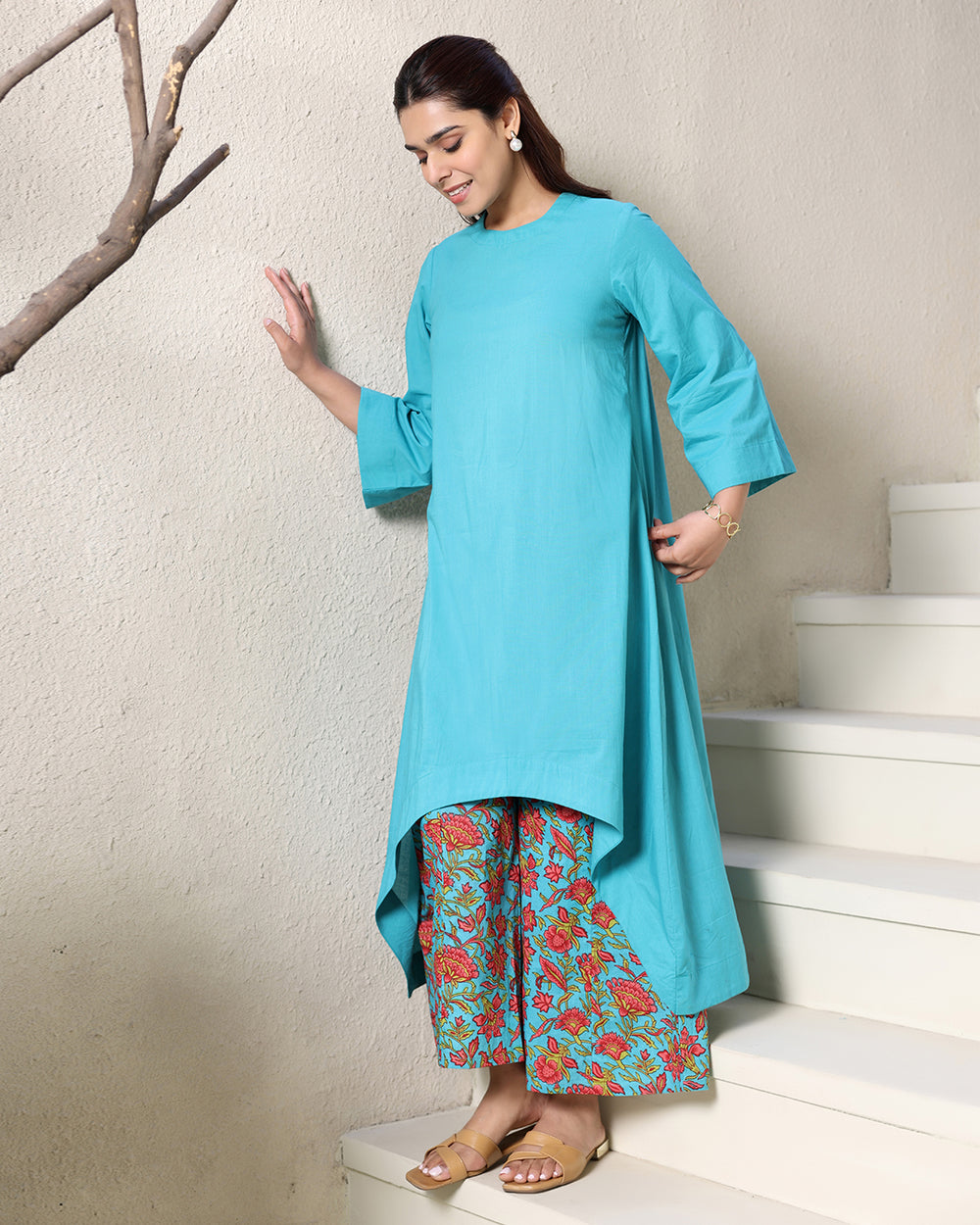 A modern take on workwear, this solid blue cotton kurta features a high-low hem for an effortless yet structured look. Paired with printed straight trousers, it offers a smart and comfortable outfit for the day.