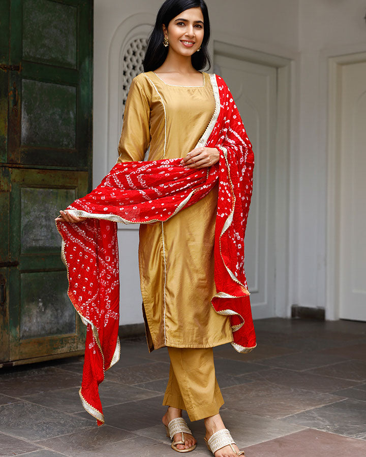 The exquisite red Bandhani Gota lace detailed dupatta and straight elastic waist pants are included in this elegant Chanderi suit set, which also includes a straight panelled Chanderi kurta with lace trimming. For the ideal look, wear this with some dramatic jewellery.