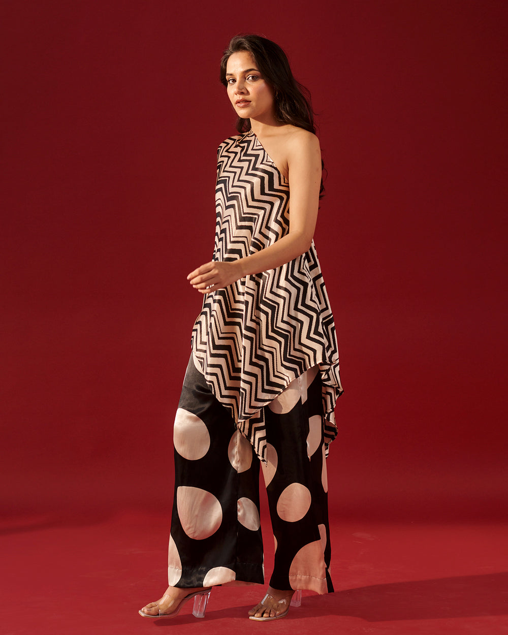 Indulge in our signature creation, encapsulating timeless design aesthetics illustrated with contemporary accents. The 2-piece tailored-to-finesse black co-ord set is crafted in time-honored gajji silk weave and includes an asymmetric top beaded with chevron print tale and a pair of straight-fit bottoms. This stunning ensemble is apt for casual outings.
