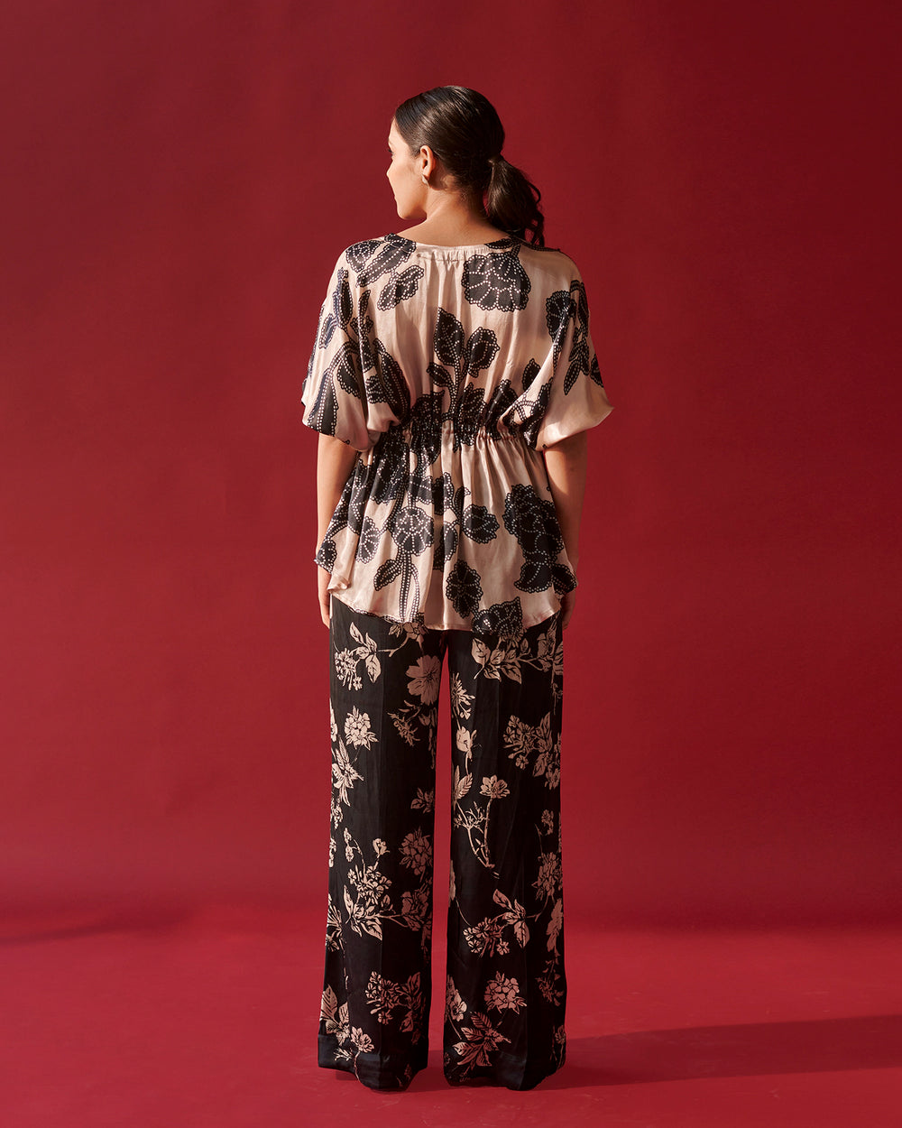 Indulge in our signature creation, encapsulating timeless design aesthetics illustrated with contemporary accents. The 2-piece tailored-to-finesse cream co-ord set is crafted in time-honored gajji silk weave and includes a v-neck kaftan top beaded with shadow floral print tale and a pair of straight-fit bottoms. This stunning ensemble is apt for casual outings.