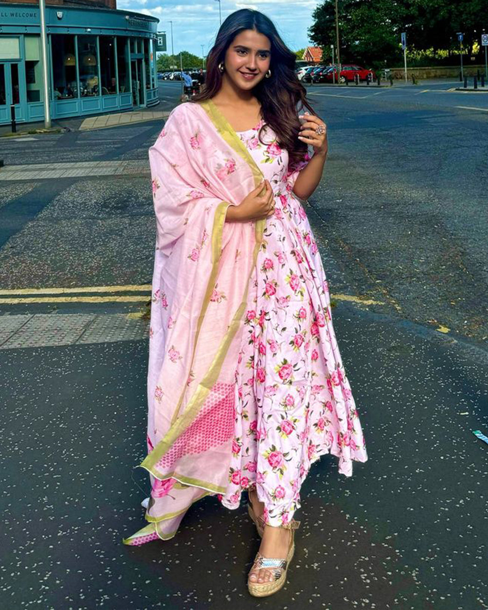 Our Dry Rose Suit Set, which includes an A-line kurta and straight pants covered in a riot of digitally printed blooms, gives you the ideal summertime escape. The Kurta has a V-neckline, a collar with contrast pink piping, and soft gathered details in the centre. It also has a potli button placket opening. Combined with a cotton silk dupatta with a digitally printed zigzag design, you have all you need for a daydream.