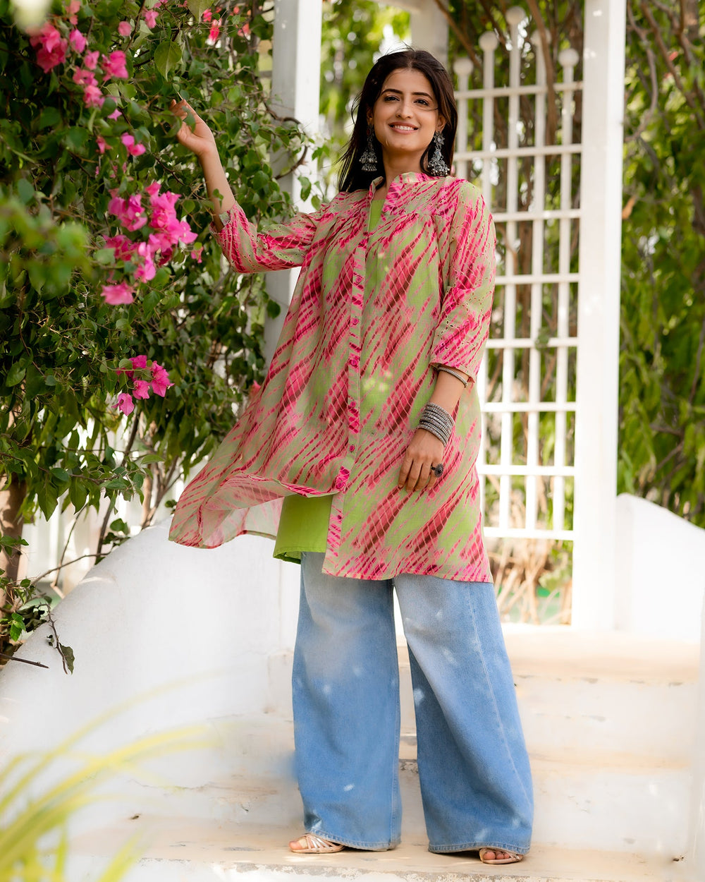 Our green button-down shirt top features three-fourth sleeves and a round neckline along with a play of schiffli detail and tie-dye print tale. Team this classic silhouette with a pair of straight pants or denims to ace a casual look.