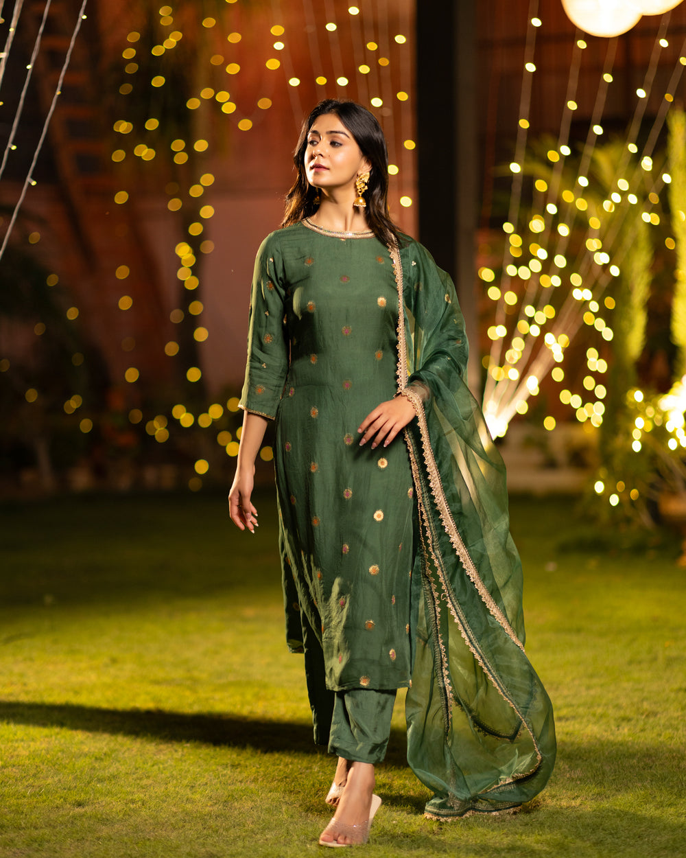 The Emerald Green Organza Suit Set features a straight kurta, adorned with golden buti detailing and an embroidered neckline. A flared palazzo pants and a matching dupatta completes the look.