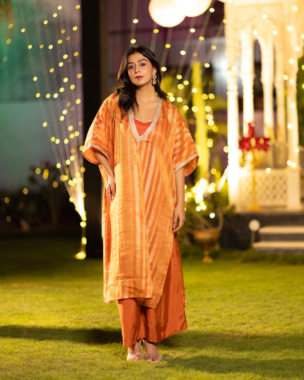 This Emerald Green Kurta Set features a kaftan style kurta, adorned with delicate gold striped detailing and the embellished neckline elevates the entire look. Paired with a flared palazzo pants.