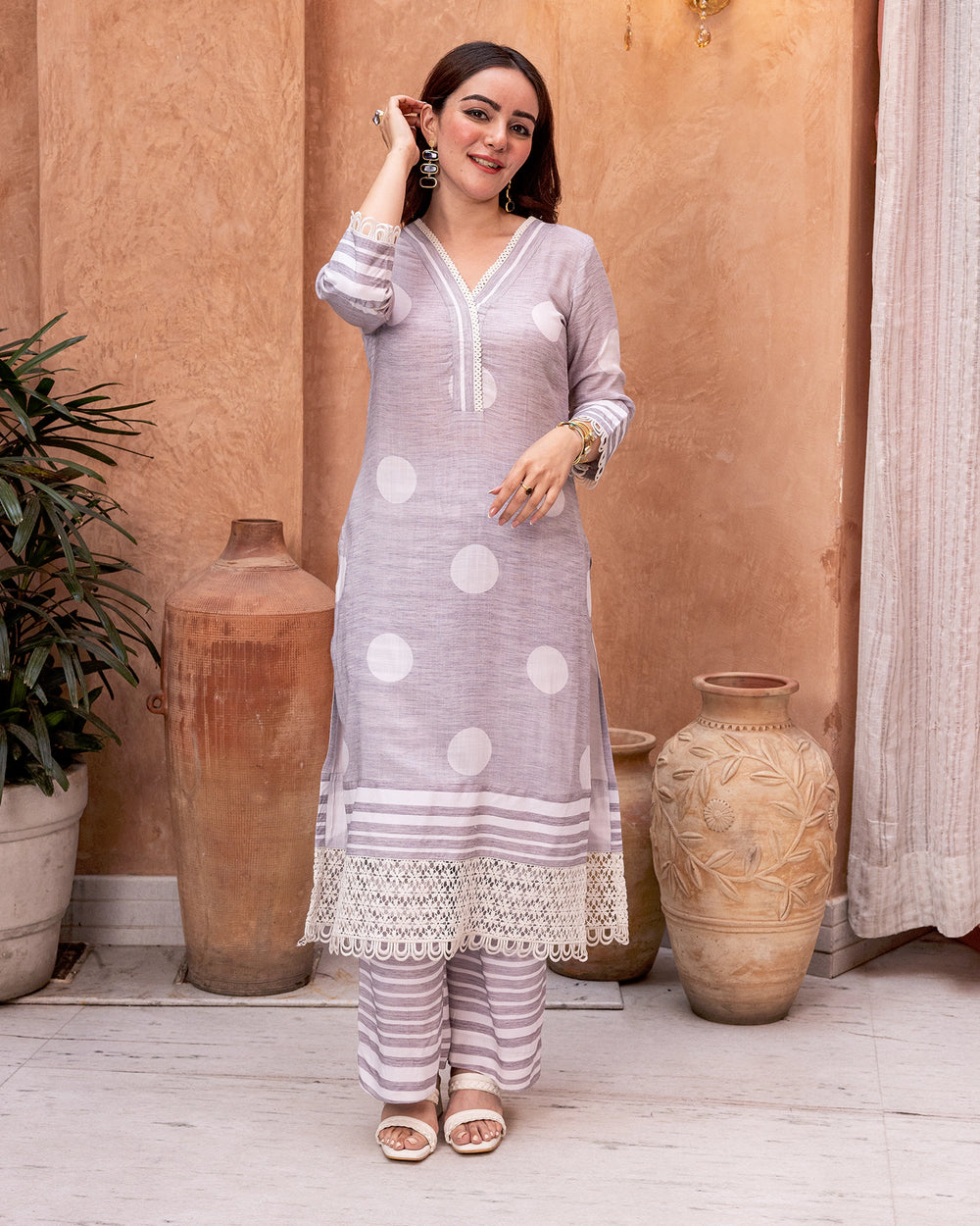 Grey Lace & Polka Kurta Set