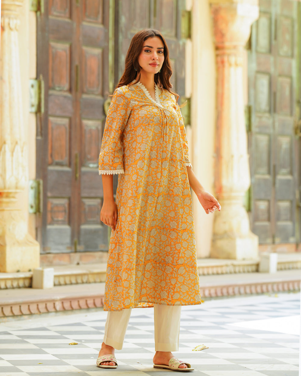 Discover the allure of our yellow summer kurta set, featuring a modern twist on traditional styles. Our 2-piece set includes a vneck a-line kurta, flared palazzos bottoms