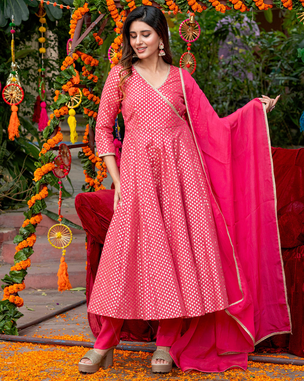 Demonstrate a regal appeal in our opulent intense pink suit set, embodying the charm of heritage craftsmanship in contemporary aesthetics. Crafted in plush chanderi and banarasi fabrics, our v-necked 3-piece ensemble features an A-line kurta with charming self-embroidered notes and tassels, a pair of straight-fit pants and a dupatta. Beaded in time-honoured weaves, this sumptuous fit is apt for intimate celebratory eves.
