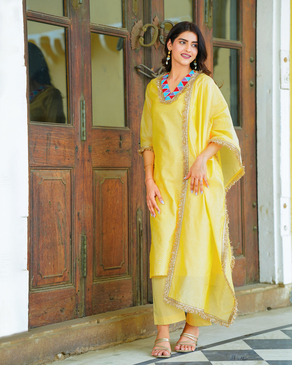 Experience the vibrant hues of our beige summer suit set, made to make you feel beautiful and confident. Our 3-piece set includes a round neck straight kurta, -na- bottoms, and a matching dupatta.