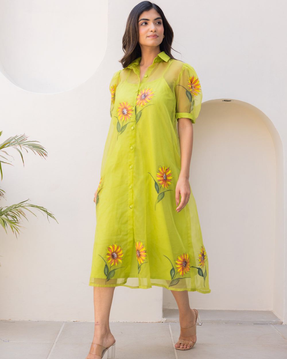A burst of freshness in lime green— this organza shirt dress flaunts hand-painted floral motifs, puff sleeves, and a sheer silhouette with a slip inside.