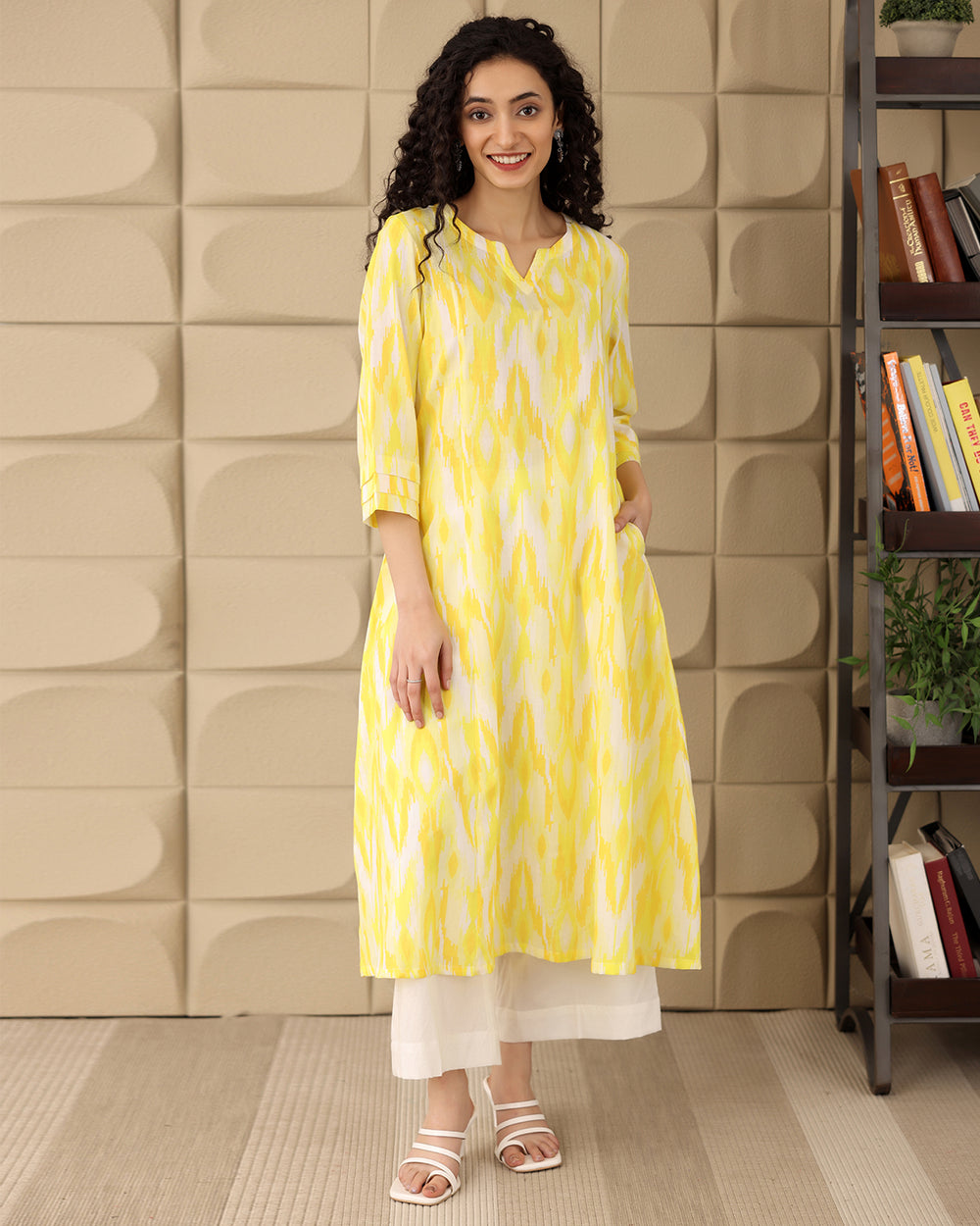A vibrant lime yellow A-line kurta with a beautiful print, paired with white flared trousers for a chic and fresh look. Made from breathable cotton for comfort all day long.