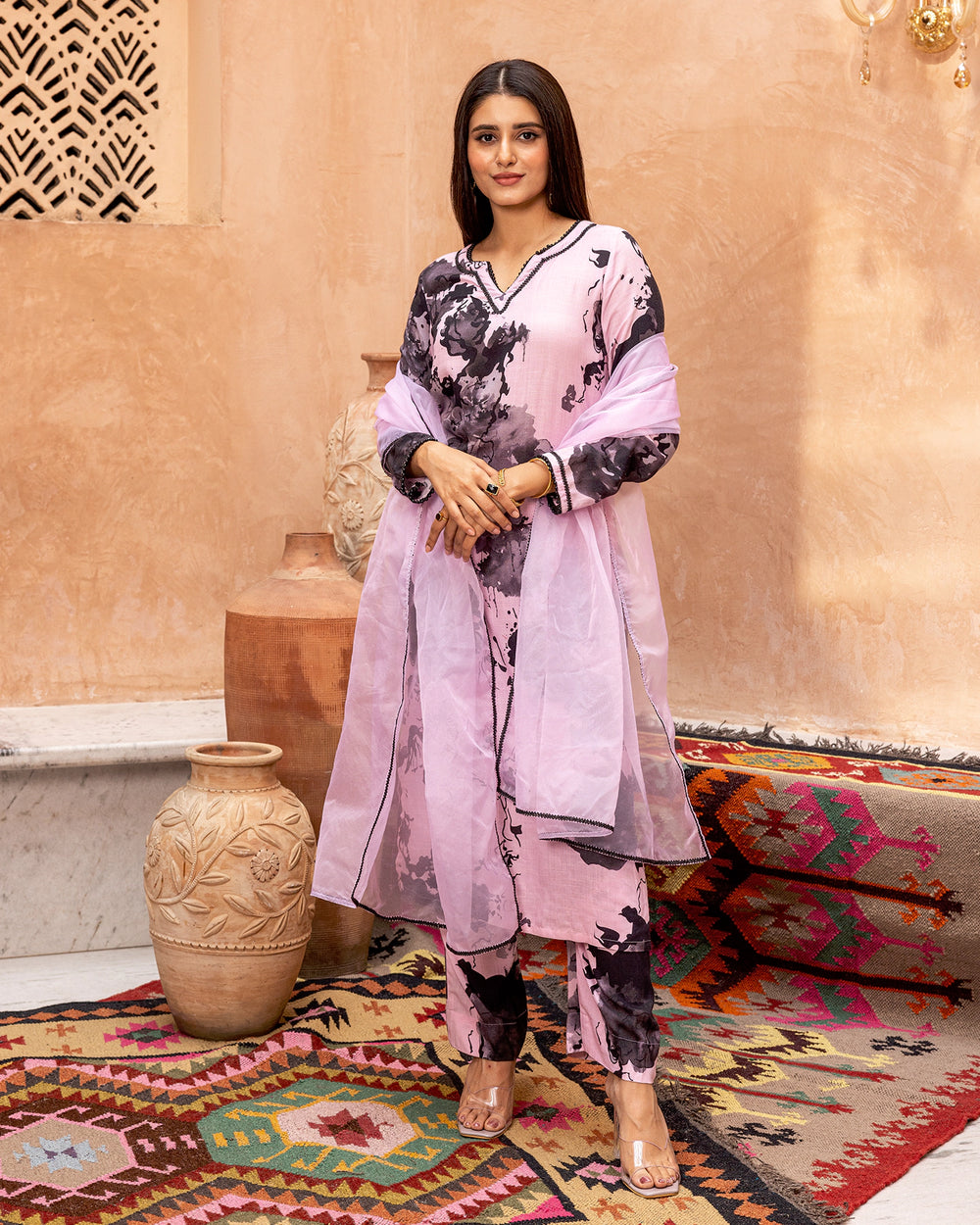 Serve a suave and oomph-worthy appeal in our breezy summer ensemble, accentuated with contemporary aesthetics and washed in a soothing palette of mauve pink. Our 3-piece assorted suit set is crafted in a premium weave of rayon and includes keyhole neck straight-fit kurta beaded with floral print tale, a pair of straight-fit bottoms, and a dupatta.