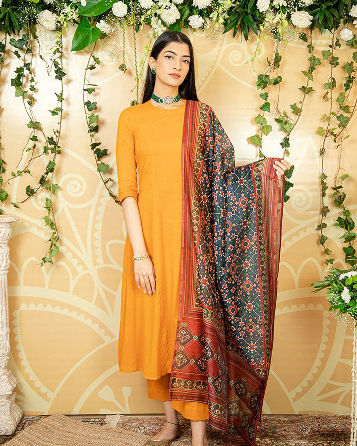Defining elegance and style with a kalamkari suit set! The mustard suit set has beautiful silhouettes, which makes it a perfect fit for every festive occasion. The kalamkari dupatta has similar ensembles as the kurta, giving the suit set a wholesome aura!