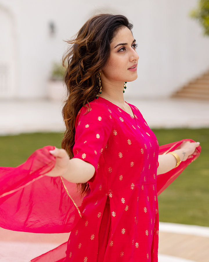 A patterned Chanderi kurta, solid elastic straight pants, and an organza dupatta with Gota lace and shell details are all included in the Neh Rani pink Chanderi outfit. It is a necessary wardrobe essential.