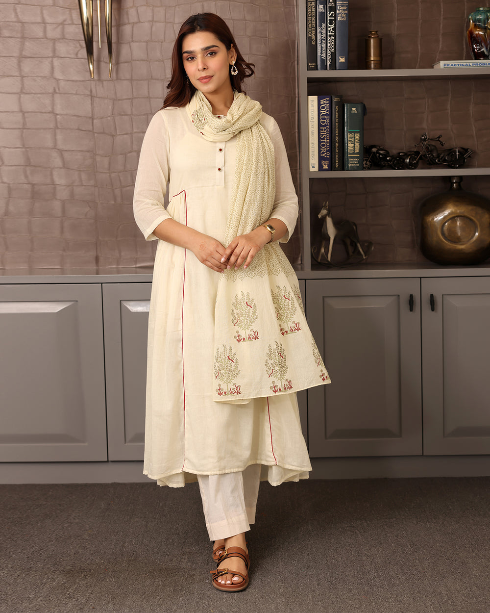 This off-white A-line cotton kurta offers a clean and refreshing look, perfect for a light and airy feel. Paired with an off-white printed dupatta, this set maintains a subtle elegance. The breathable cotton fabric ensures comfort, making it an ideal choice for daily wear.