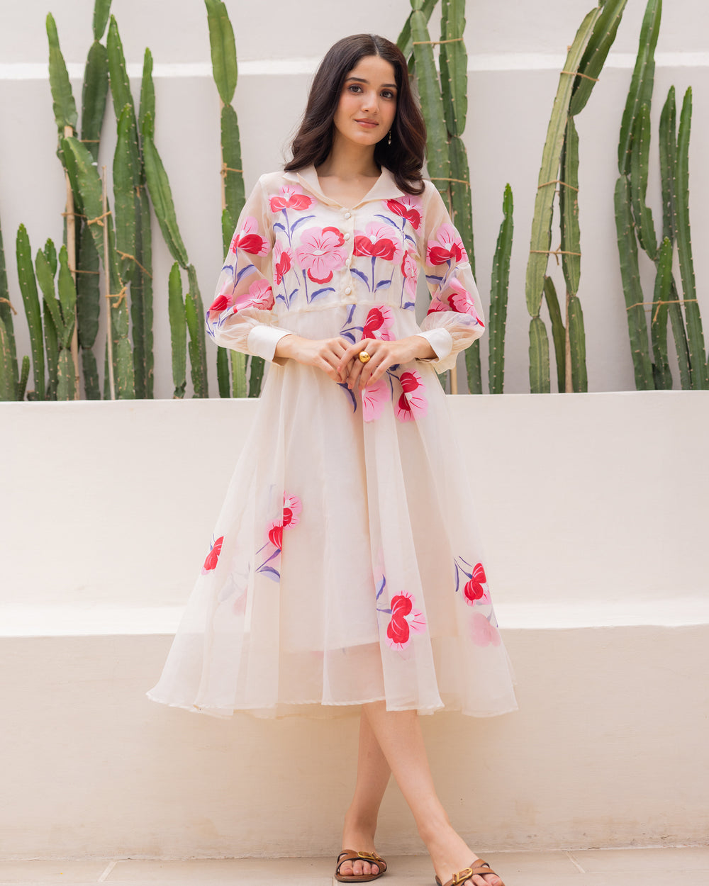 A dreamy organza dress with soft floral prints, shirt-style collars, puffed sleeves, and a flared silhouette. Comes with a matching slip for ease.