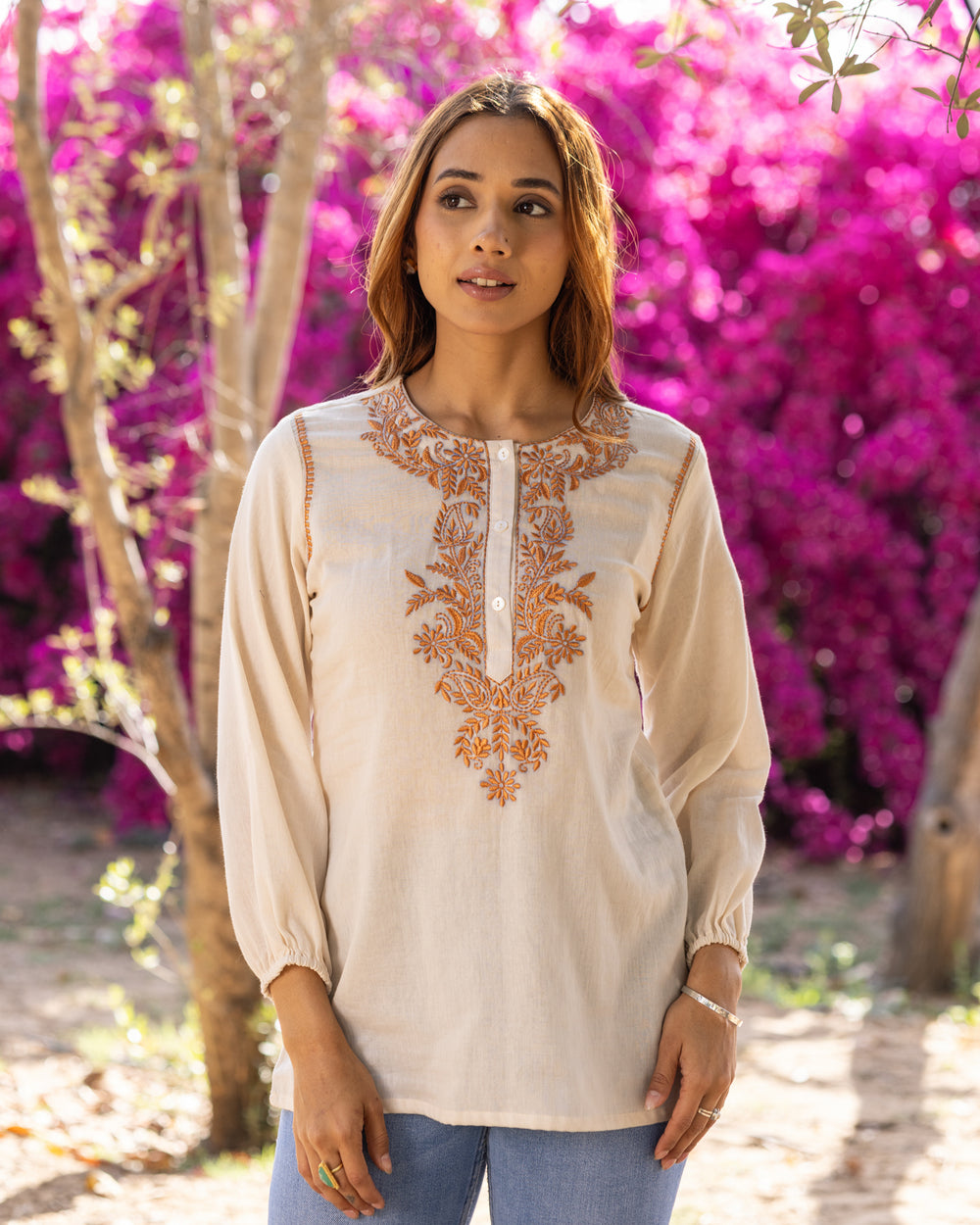 Dress up in simplicity with the Off-White Threaded Treasure Top. Its delicate embroidery adds a touch of elegance, making it great for both office days and casual outings.