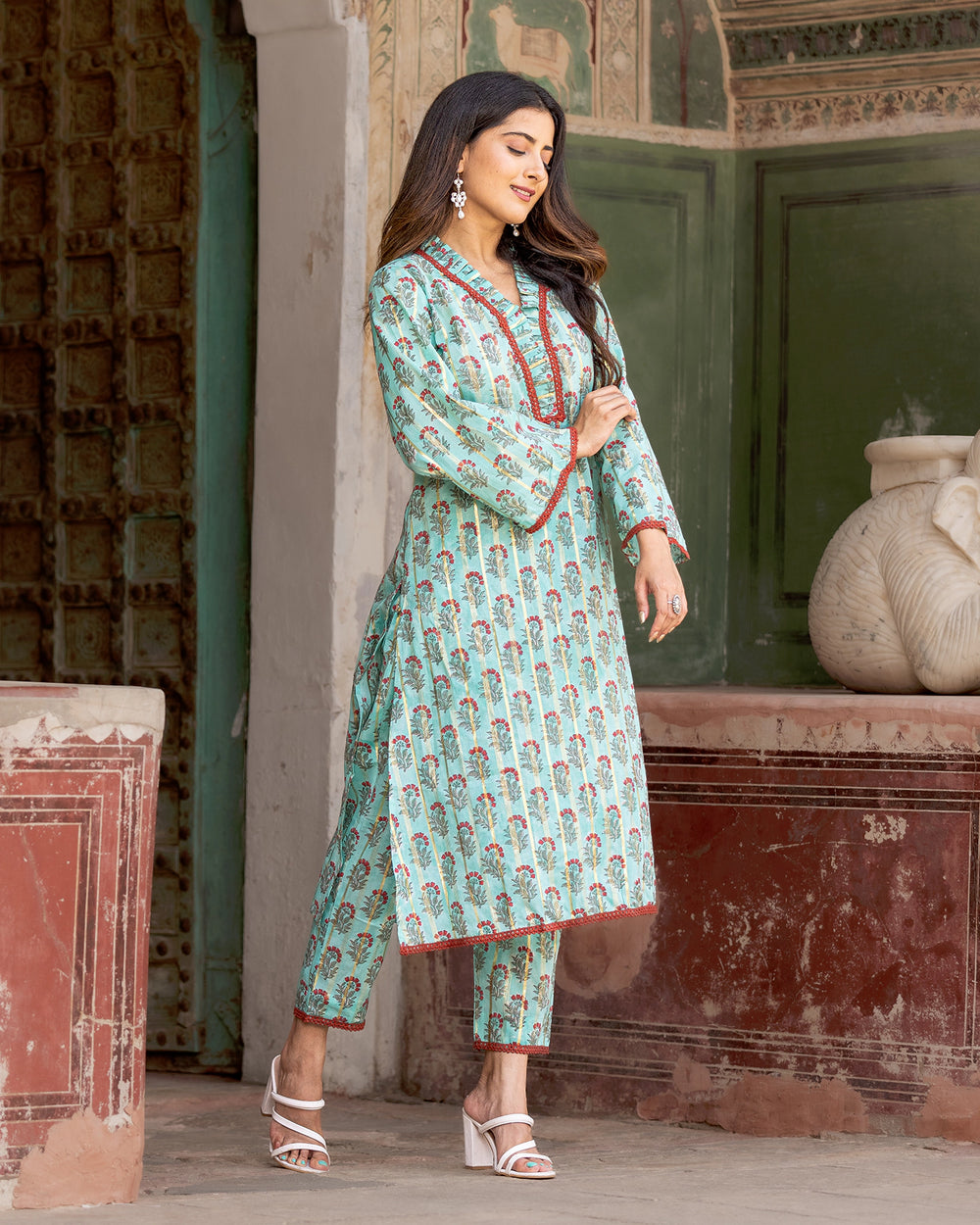 Embrace ease & elegance in our pastel green cotton kurta set. Crafted with finesse, our 2-piece ensemble features a ruffled v-neck straight kurta depicting charming floral print play in contrasting hues and a pair of straight-fit pants. This contemporary fit is ideal for light festivities or a casual day-out.