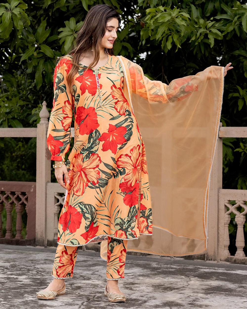Embrace elegance in our peach muslin suit set. Crafted with finesse, our 3-piece ensemble features a round neck straight kurta depicting charming floral print tale in a contrasting tone, a pair of straight-fit pants, and a stunning ornated dupatta. This contemporary fit is ideal for day festivities.