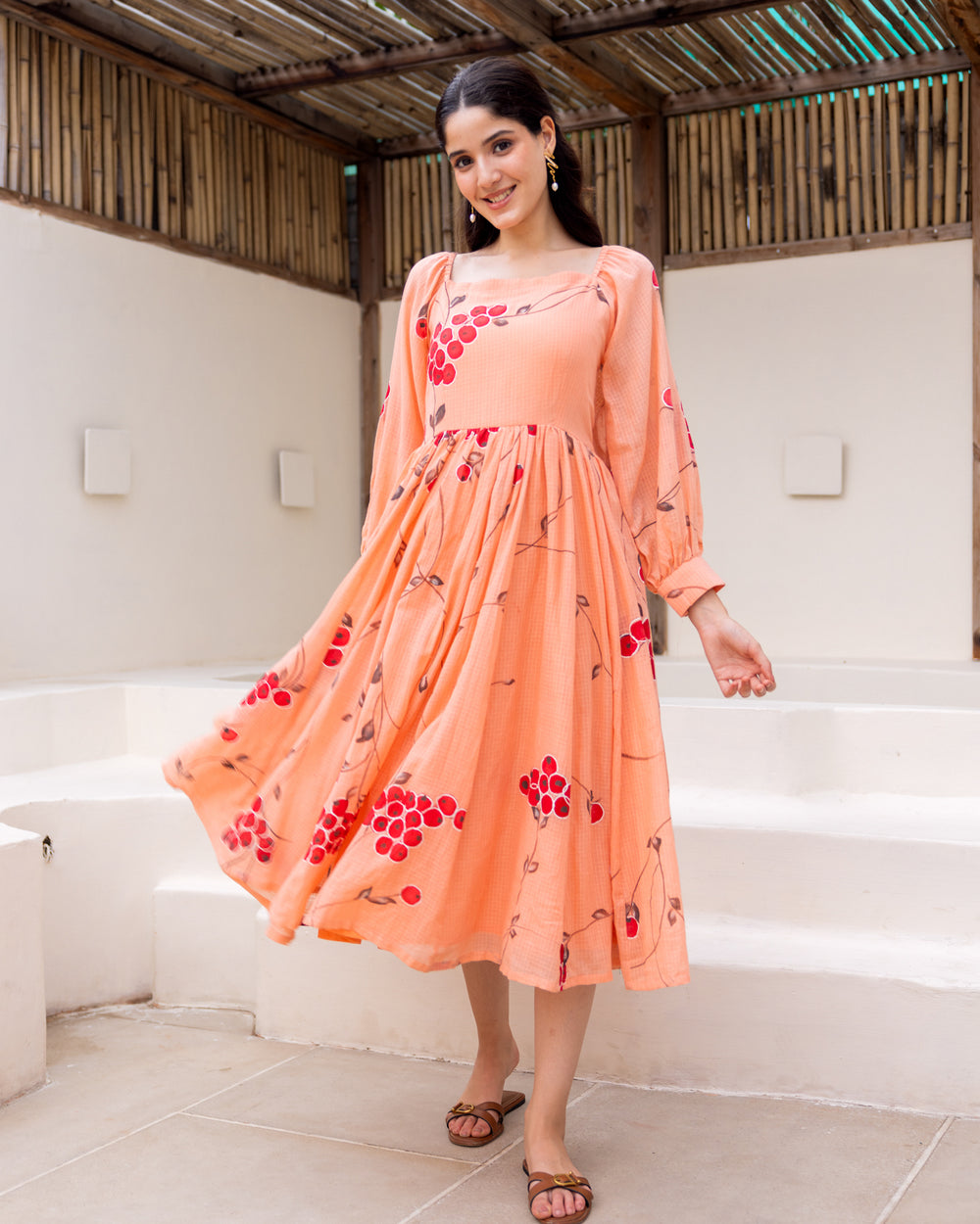 Think summer, think joy — this peach-orange cotton Kota Doria dress blooms with cheery-ful prints and features a chic square neckline.