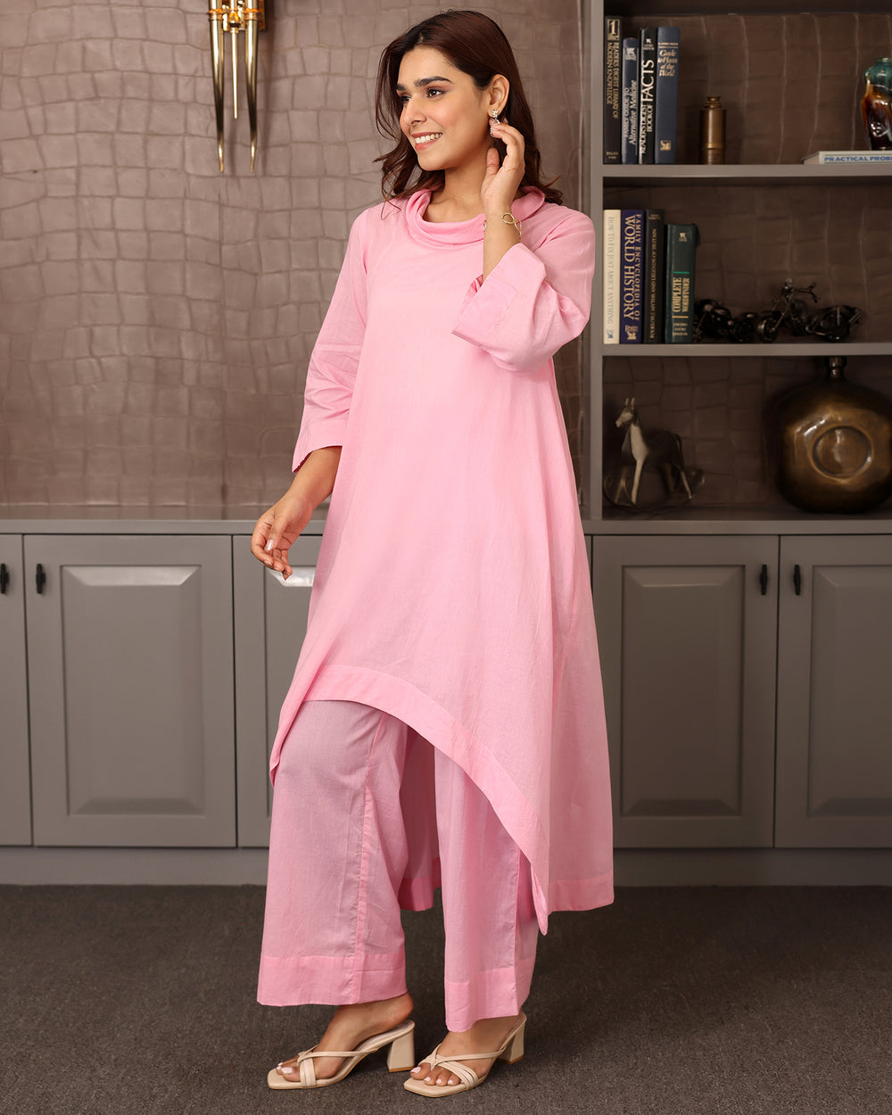 A chic cotton kurta in soft pink, designed with a high-low hem for a contemporary touch. Paired with straight trousers, this set offers a refined yet effortless look, perfect for workwear.