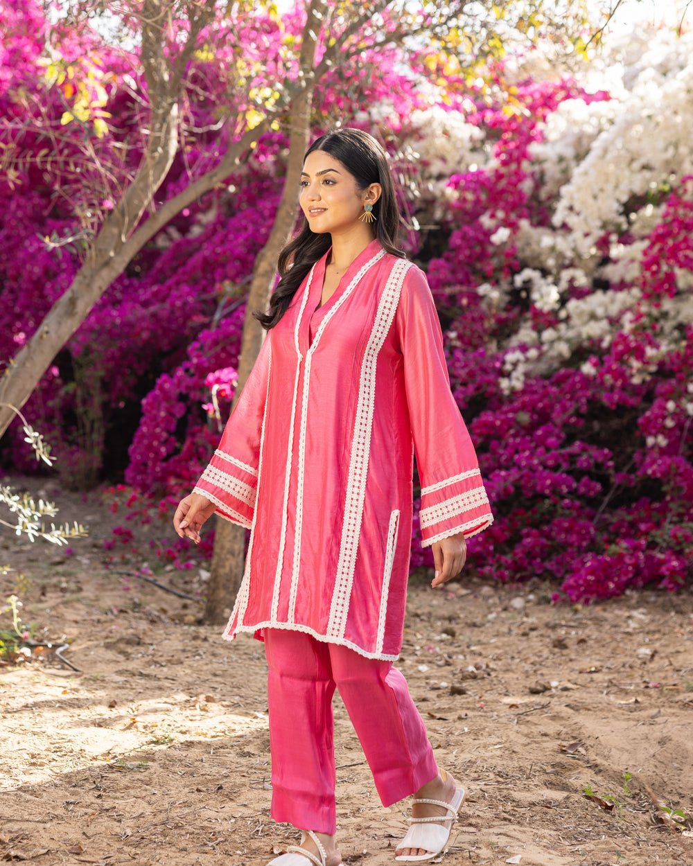 Celebrate in style with this Pink Lace Kurta Set boasting traditional lace motifs on luxurious fabric.