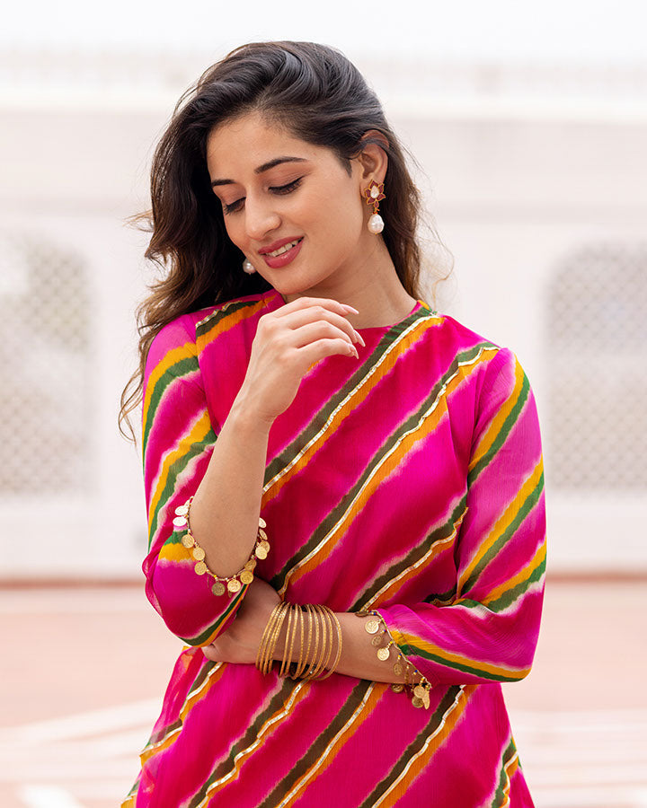 A high-low kurta in pink with Gota lace accents on the the front and coin lace on the sleeves is matched with plain elastic straight leggings. Add some torn jewellery to complete the look.