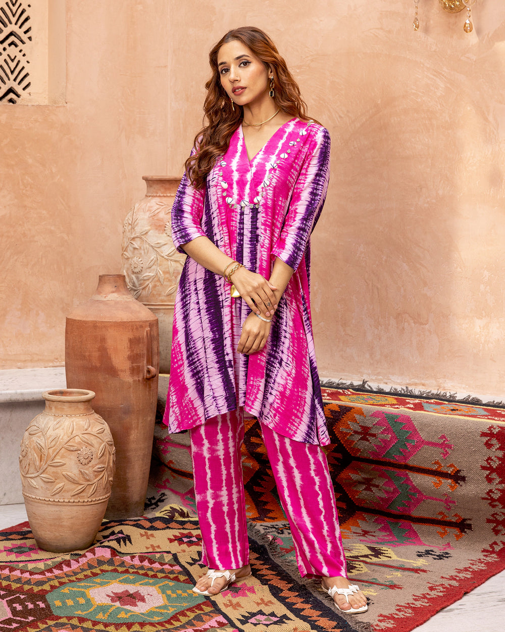 Serve a suave and oomph-worthy appeal in our breezy summer ensemble, accentuated with contemporary aesthetics and washed in a sublime palette of pink. Our 2-piece assorted kurta set is crafted in a premium weave of rayon and includes a V-neck A-line kurta beaded with tie dye print tale, and a pair of straight-fit bottoms.