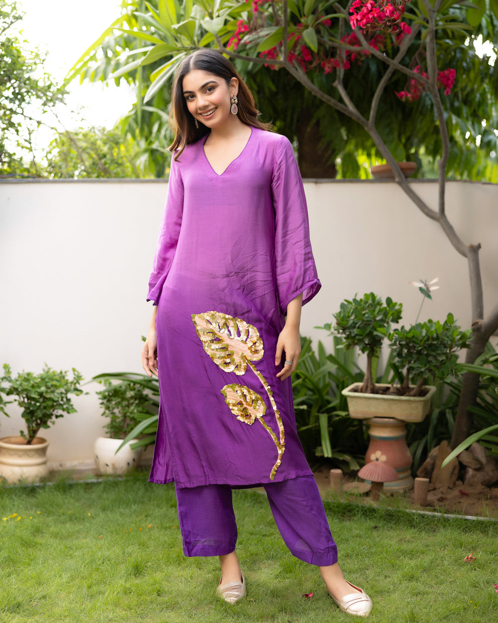 The Purple Ombre Kurta Set features a straight kurta.The highlight of the set is the exquisite handwork of tropical leaf motifs on the kurta, adding a touch of artistry. Paired with matching straight pants to complete the look.