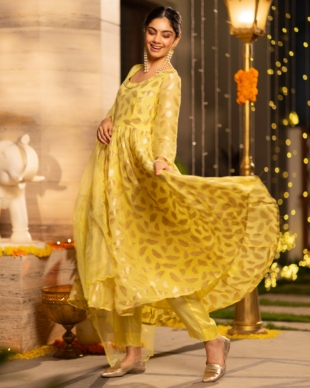Style Tips: Accessorize with gold jewellery to complement the yellow tones - try chandelier earrings with gold or beige heels or juttis.