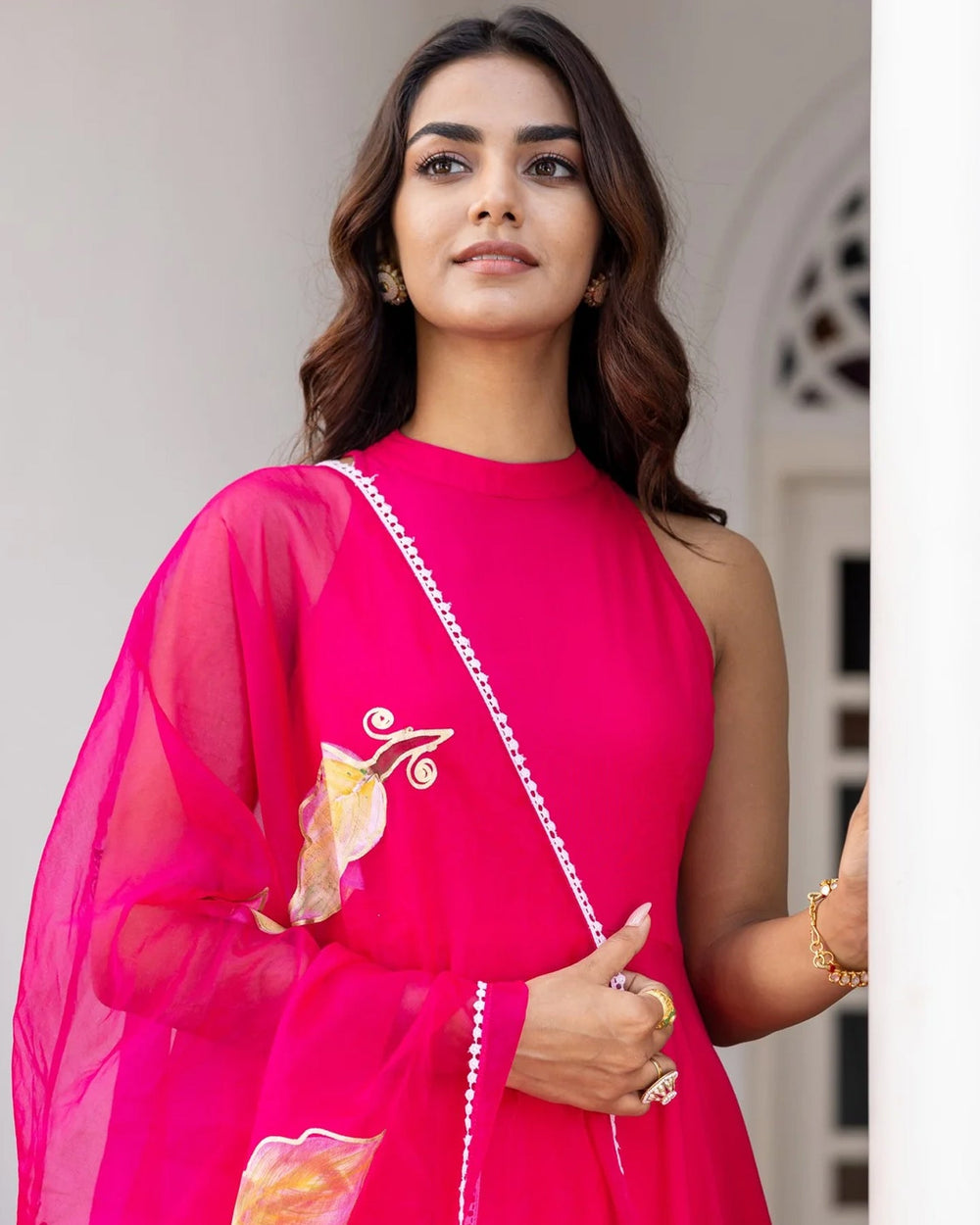 It includes a magnificent hand-painted organza dupatta with sophisticated handpainted flowers. This Rani back ties suit set features an attractive back tie pattern and a simple silhouette with sleeveless sleeves.