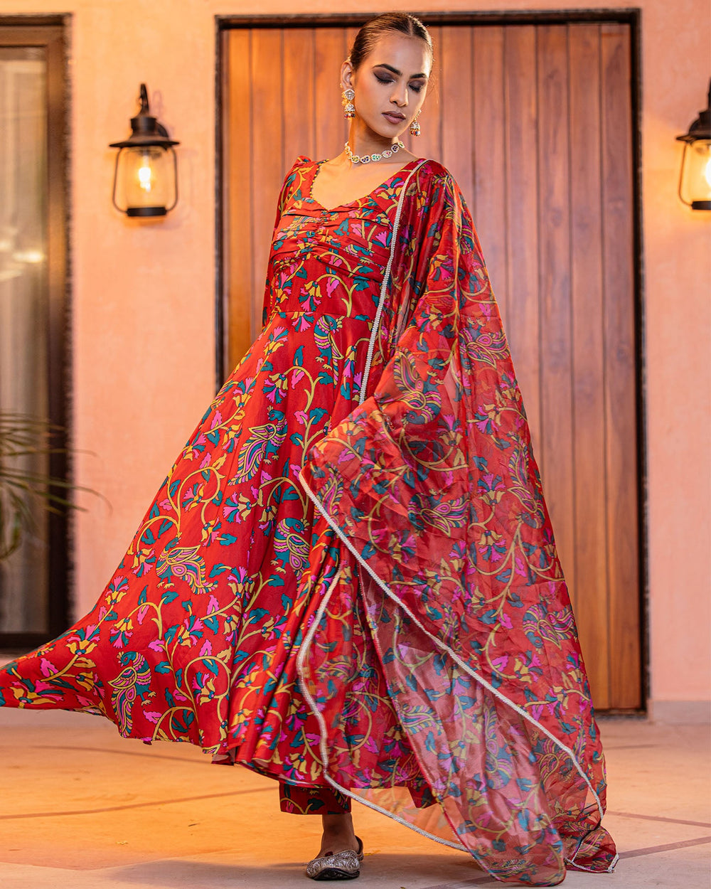 Make every day a little more radiant with the Shringar Red Floral Muslin Anarkali Suit Set.