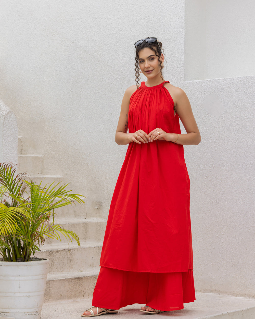 The Red Halter Neck Kurta Set represents Ambraee’s fearless and fluid aesthetic. The sleeveless top features a gathered halter neckline that drapes into a voluminous A‑line overlay, creating movement and ease. The matching palazzo trousers are cut wide and airy, balancing structure with comfort. Crafted in a rich red hue, the ensemble channels festive energy while staying true to modern Indian sensibilities. Wear it for celebrations or evenings out when you want a look that’s both striking and effortless.