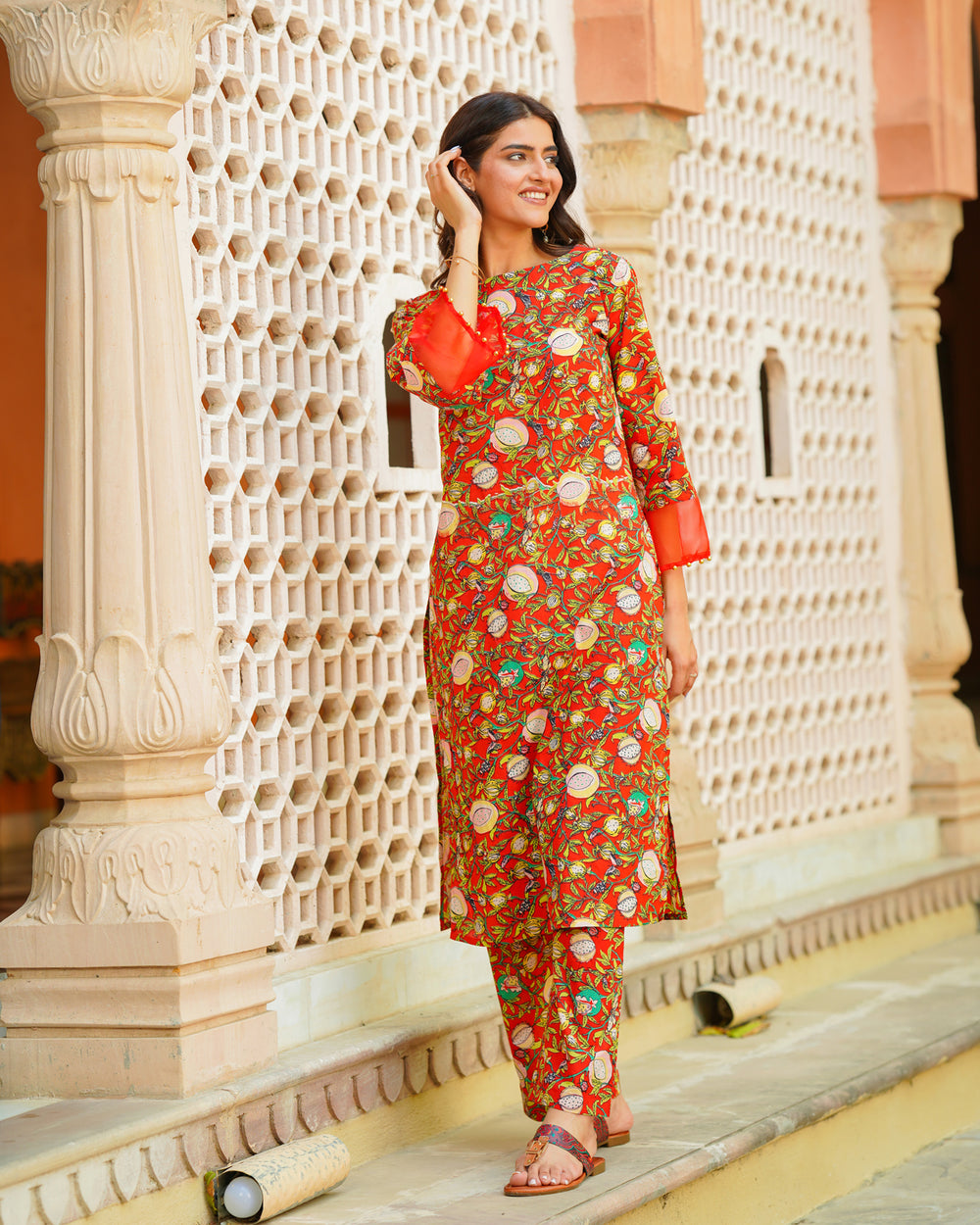 Experience the vibrant hues of our red summer suit set, with a pattern that is sure to catch everyone's eye. Our 2-piece set includes a round neck straight kurta, straight pants bottoms