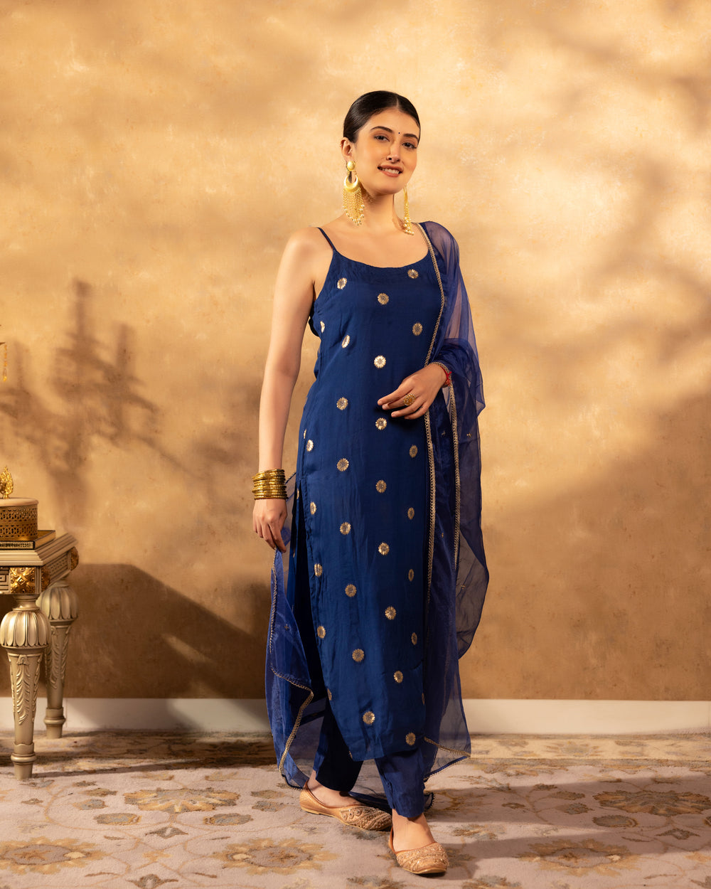The Sapphire Blue Suit Set features a strappy sheer organza kurta with golden buti work all over. Paired with matching straight-cut pants and solid blue dupatta to complete the look. The set combines traditional elements with modern styling.