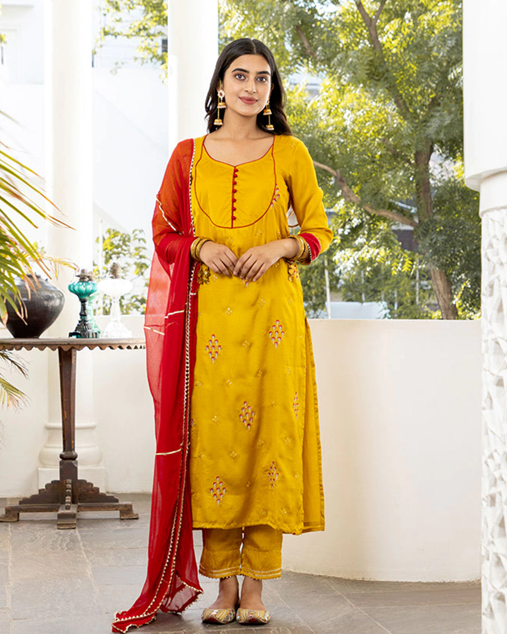 Simple and elegant - that's what it is. Sara mustard suit set brings brightness overloaded with red potli button yoke and the embroidered suit has the same blended fabric pants with a contrast elegant dupatta with gota detailing.