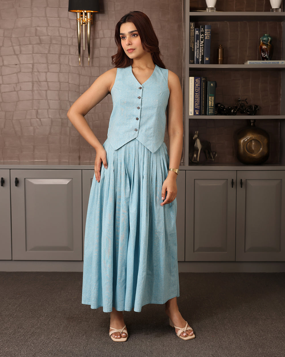 This sky blue cotton co-ord set is a refreshing addition to your workwear wardrobe, featuring a structured vest top and flowy flared palazzo pants. Lightweight and breathable, it keeps you comfortable while looking effortlessly stylish.