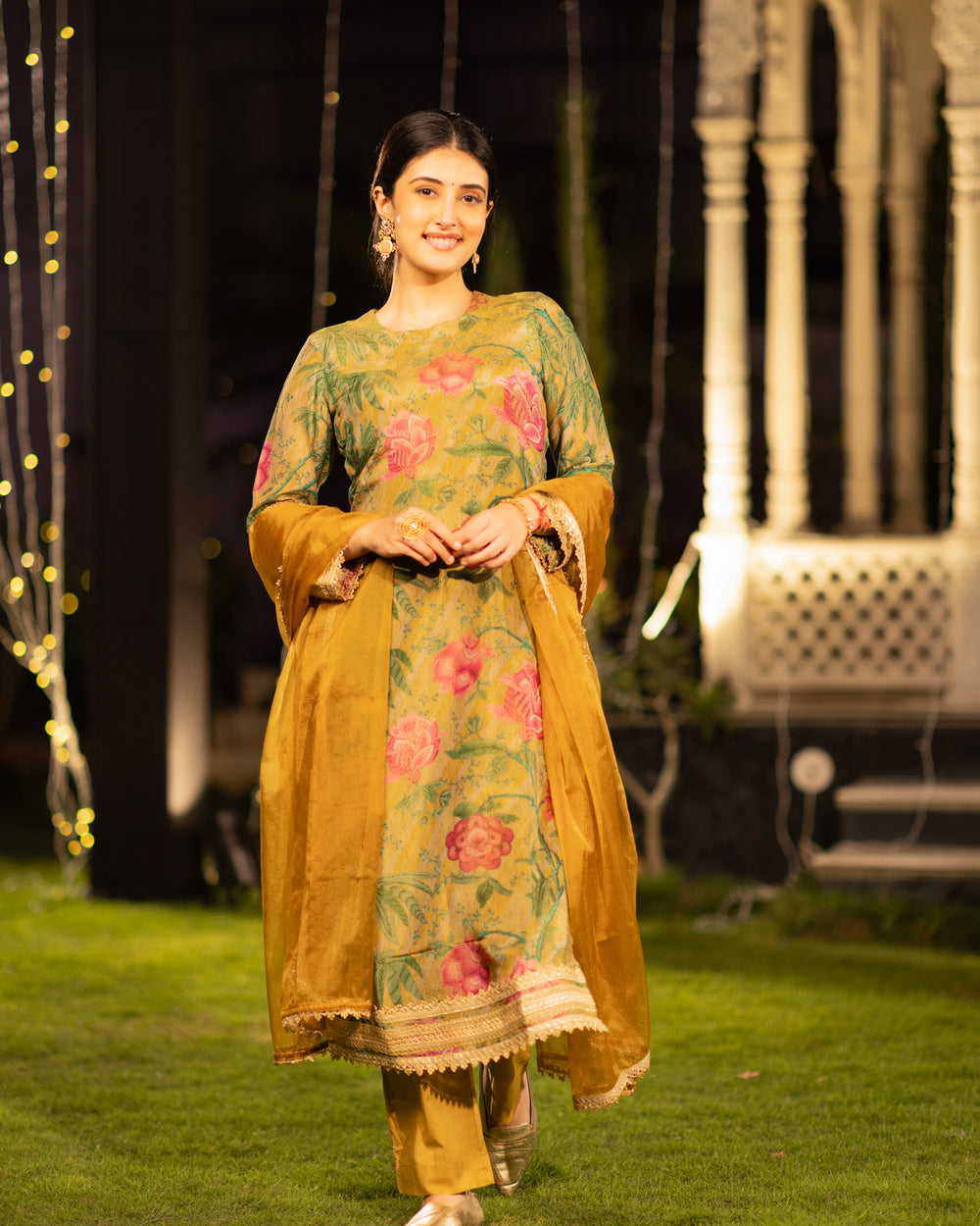 The Spring Flora Suit Set features a playful pink floral print to the mustard yellow base that adds a touch of vibrancy. The kurta is designed with an embroidered border at the hem and cuffs. It is paired with straight pants and a coordinating dupatta, combining style and comfort.
