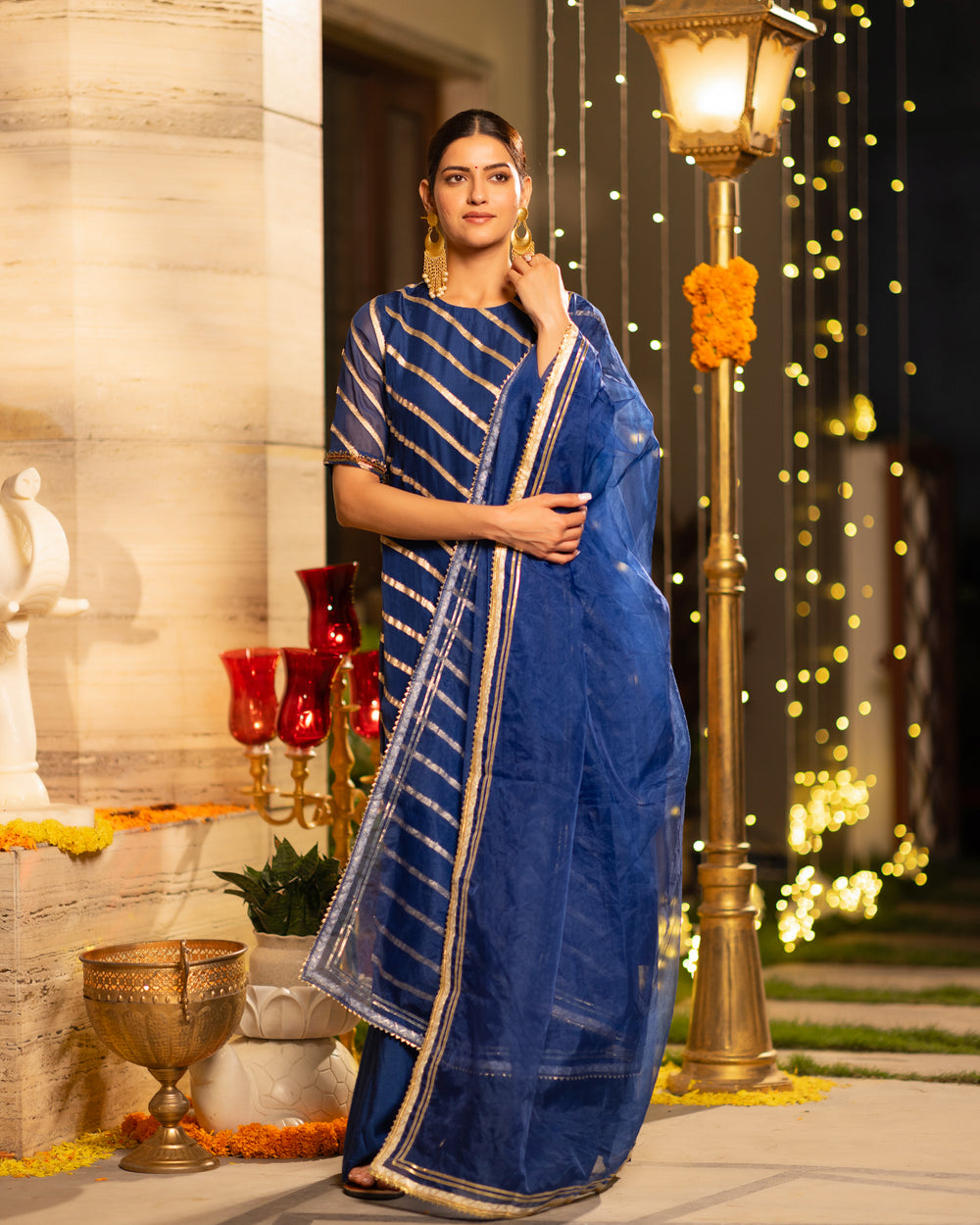 The Stripe Royal Blue Suit Set features a straight kurta adorned with diagonal gold stripes. Paired with matching straight pants, providing a sleek silhouette to balance the flowing kurta and a coordinating dupatta to complete the ensemble.