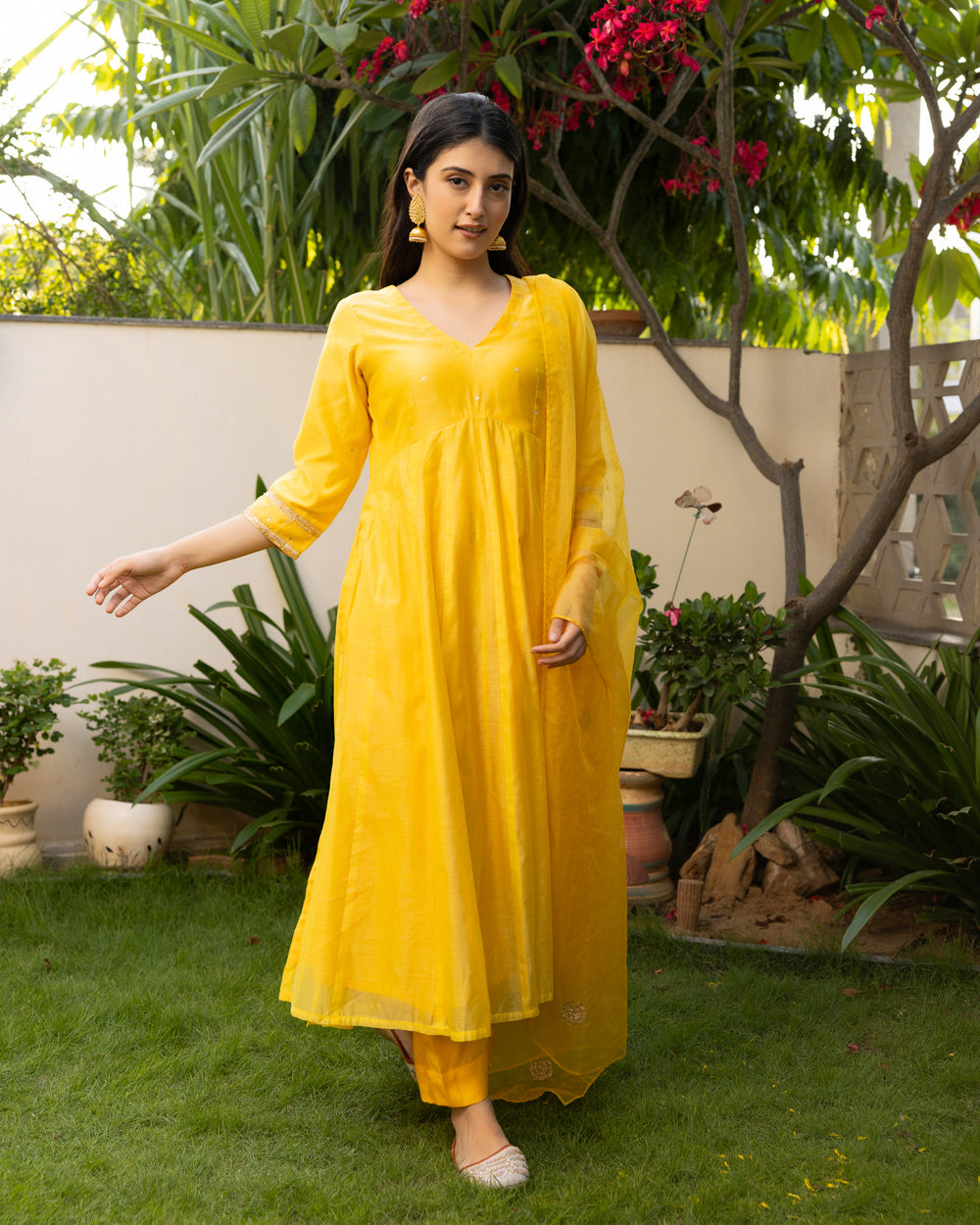 This Sunflower Yellow Chanderi suit set features a kalidar kurta flaunting a flattering V-neckline and beautifully highlighted handwork on the yoke. Paired with straight pants and a matching dupatta.