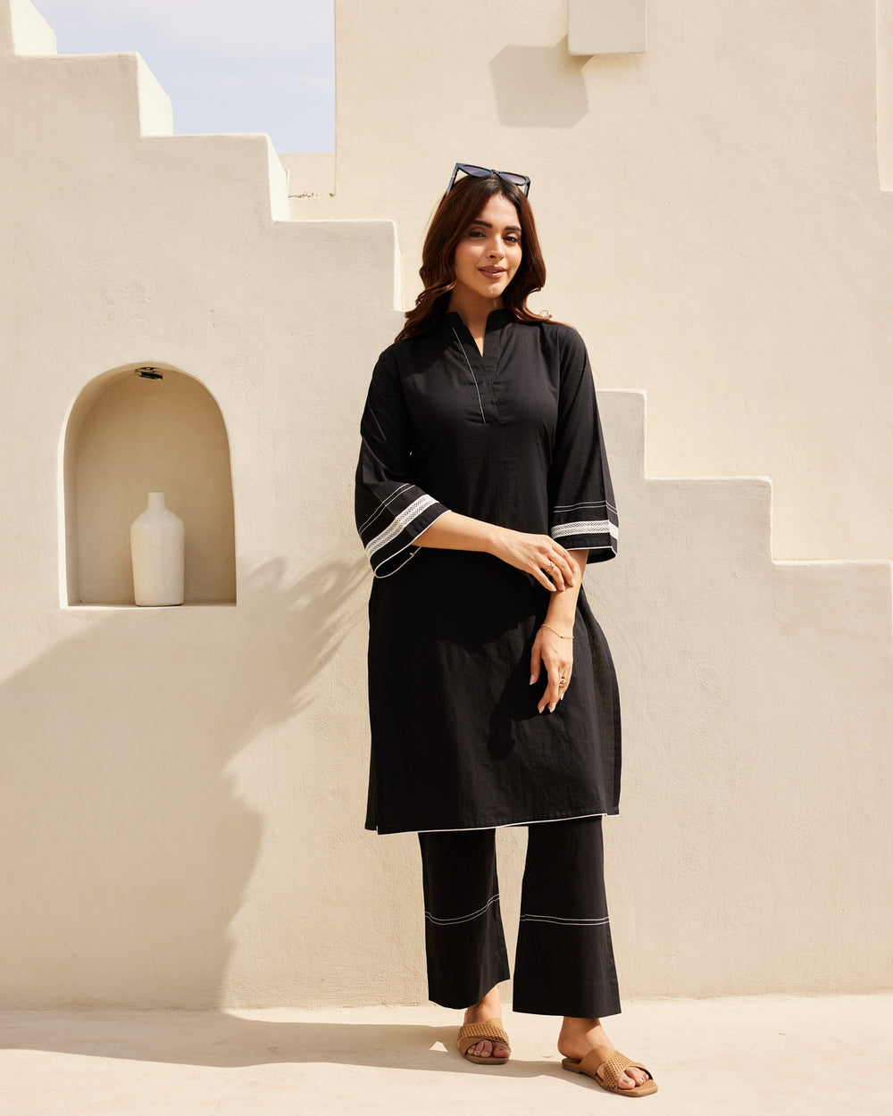 Define your style with the Timeless Black Kurta Set. This set features a collared, full-sleeve kurta paired with straight pants, both crafted from premium cotton. Suitable for casual occasions, its solid pattern exudes a modern, minimalist aesthetic. This easy-to-wear ensemble is designed without a zip, focusing on comfort and sleek design.