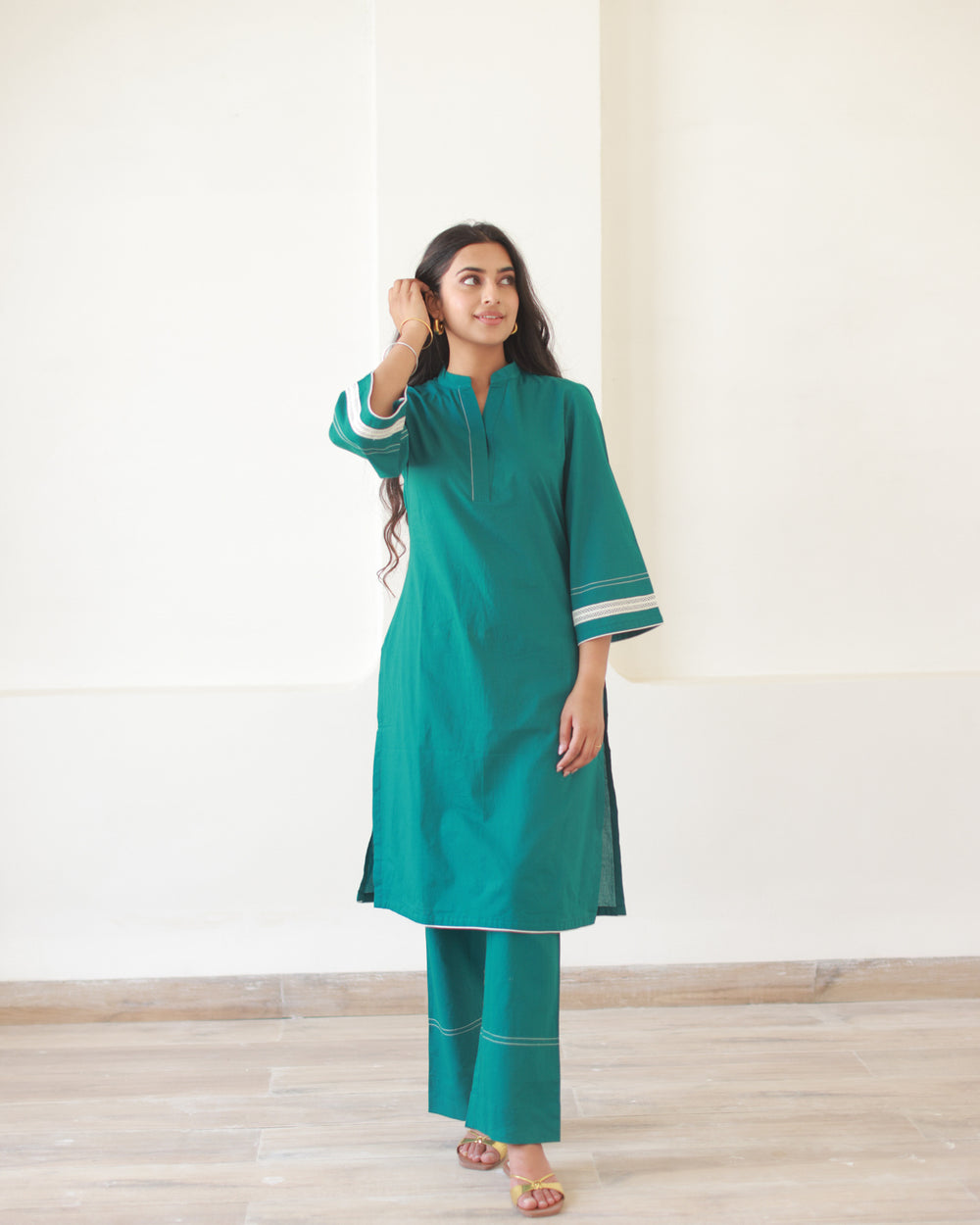 The Timeless Green Kurta Set is your classic wardrobe essential. Featuring a collared, full-sleeve kurta with straight pants, this ensemble is perfect for any casual setting. Crafted from soft cotton, it offers a comfortable fit and a solid pattern for an understated yet elegant look. Designed with simplicity in mind, it includes no zips, ensuring a seamless and refined style.