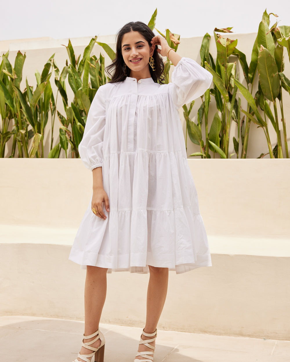 Enjoy the pure beauty of the White Basic Tiered Dress, designed with puff sleeves and a round neckline. Crafted from cotton, this dress's tiered structure offers a breezy, comfortable fit, perfect for any casual setting.
